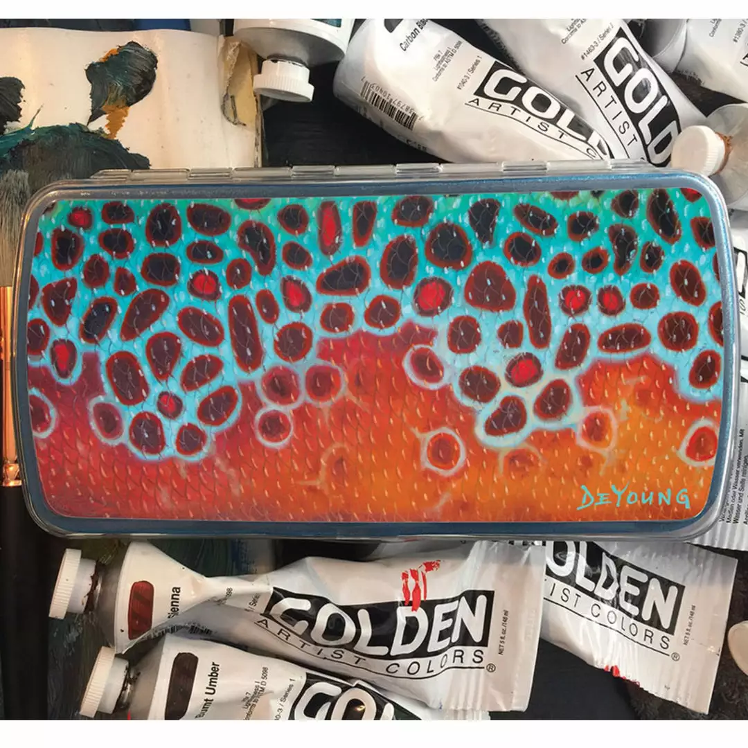 - Skinned with DeYoung Brown Trout Flank artwork on both sides of the box! Water and Scratch Resistant material.