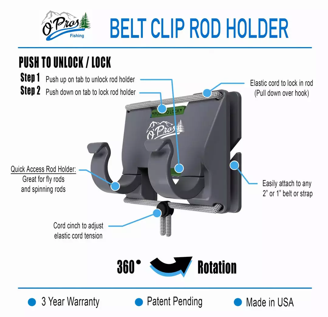 We have all been there, standing in the middle of a river or stream or on the shore with nowhere to place your expensive rod when retying a fly, lure, or other. Well, the O’Pros belt clip rod holder gives you an extra hand when you need it! Perfect for both spinning and fly rods. Easily attach the belt clip rod holder to any 1” to 2” wide wading belt, pants belt, etc. Simply place your rod into the rod holder, select the desired angle, lock it in and you instantly have a 3rd hand holding the rod in place. For over 5 years the belt clip rod holder has been providing fishermen like you an extra hand so that you can spend more time fishing and less time fumbling with your rod.