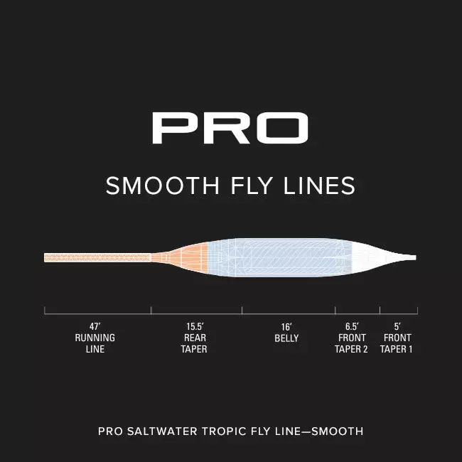 PRO Saltwater Tropic is an exceptional smooth fly line designed to meet the needs of anglers chasing tropic game fish, whether by skiff or wading the flats. The line was built with a stout head for wind-cutting power and distance casting ability, and yet the carefully engineered advanced, convex compound front taper is fine-tuned to improve the presentation for those spooky fish cruising a flat. The PRO Saltwater Tropic is built on a stiff monofilament core to retain optimum performance in hot weather and warmer water.