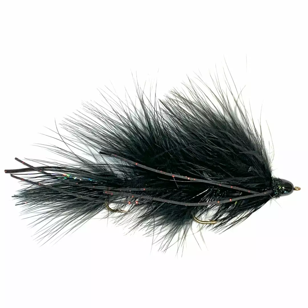 This is Kelly’s tribute to one of the most successful articulated streamer patterns of all time– Russ Madden’s Circus Peanut. He replaced the Estaz body of the original peanut with ice dubbing, and substituted a conehead for lead eyes as the head, still giving it that diving motion that Russ’ pattern is so famous for. An additional tuft of marabou behind the head of both hooks helps it maintain a little deeper profile, and it has been fishing just as good, if not better, than the original peanut.