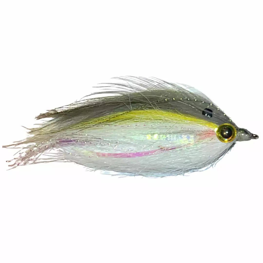 Need a sparse, slim, shadalicious minnow that looks and swims just like the real thing? Dave Whitlock hit a home run with this pattern. This fly has a near color pattern and silhouette of a shad. This fly swings in the current of a river or can be fished on a sinking line for suspended bass. They just won’t be able to hide from the Deep Sheep Shad! Size 6 is just over 2″ long. This is a weightless version that will land softly in clear shallow water to keep from spooking fish.